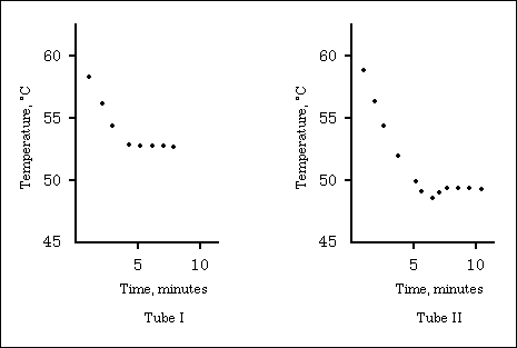19) Tube I contains 10 grams of substance A at 60 °C, and tube II, also at 60 °C, contains 1 gram of substance B dissolved in 10 grams of A. As the tubes and their contents cool, temperature readings are taken at 1-minute intervals. For tube I the readings are as follows: