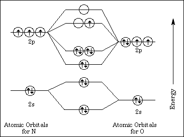 The diagram above represents the molecular-orbital energy-level diagram for the NO molecule.
