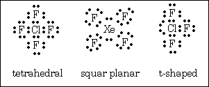 ClF3 - 3 bonding pairs and 2 lone pairs give trigonal bipyramid with lone pairs in equatorial positions 120° apart.