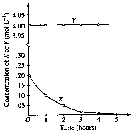 63. The graph above shows the results of a study of the reaction of X with a large excess of Y to yield Z. The concentrations of X and Y were measured over a period of time. According to the results, which of the following can be concluded about the rate of law for the reaction under the conditions studied?